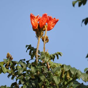 週末ドライブ🚗💭 で出会った花 🔥カエンボク🔥 枝先に炎がぽっとあがり 火炎のように見えることからの ネーミング。 又、花の形が大型のチューリップに 似ている事から アフリカンチューリップとも 呼ばれてるよう様ですよ。 開花期は、3~8月と言われて ますが農道沿いのこの木は 未だ咲いてました🌸◦° 世界3大花木 カエンボク ジャカランダ ホウオウボク ノウゼンカズラ科 カエンボク属