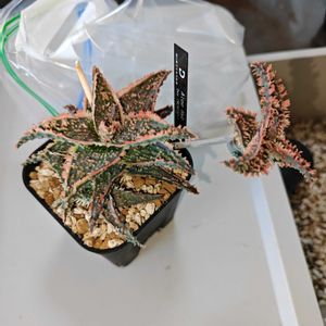 アロエ ディンティティ 25年1月10日購入 MSE アロエ、ハオルチオイデス×ディスコイングシーの交配種です。非常に小さく群生する感じです。ハオルチオイデスの葉の細さはあまり好きじゃないので買ってないですが、この葉幅が広いのは好きです。 交配に使いたいな〜😊 300ペソ