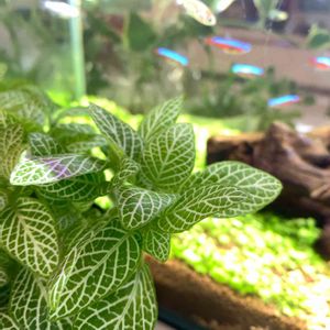 おはようございます😊 今日は観葉植物を水槽と共に😊 フィットニア バリエーション😊💚 リーフが爽やかな色で白い葉脈がとても綺麗です😊 水槽の下の緑の絨毯も、種から植えて3ヵ月です😊💚 緑を家の中で見ると、癒されますねー😊💚 今日は金曜日😊 今日も穏やかな一日をお過ごしくださいね🌸