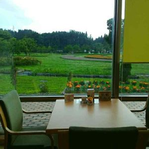 レストランの待合から見える風景🌳✨ 和モダンな家具とマッチして、最高だわあ✨ 外のコテージには足湯👣♨️も~~~✨✨ 紅葉の季節は倍綺麗でしょうねぇ🍂🍁🌾🍄