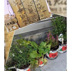 いつもとちょっと違う角を曲がると小さなイタリアンレストランが😄 アプローチの植物たちは🍅缶に収まっていました😉 入口からイタリアンカラー😋