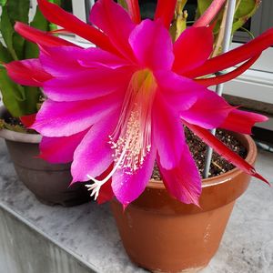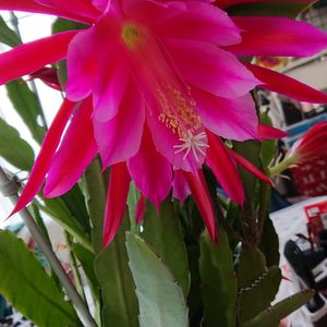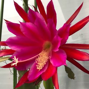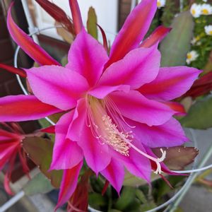 真夜中にジャラ~ン お答えします😅 クジャクサボテンでした。お友達から赤と白頂きました。一番先に赤が咲きました 赤の勝ち👏( ˊᵕˋ )👏( ˊᵕˋ ) あははーさん正解です 🎉🎉🎉🎉🎊🎉 おめでとうございます( ¨̮ )💕 とても大きいです。ツボミも沢山あります