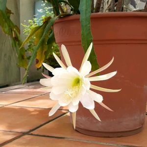 クジャクサボテンが咲いた〜(∩´∀`@)👍 去年一昨年は濃いピンク🎀今年は白🤍𖤐⸒⸒色変わったりするのかな??🤔 ちなみに株分けしてくれた人の花色は濃いピンク。なあぜなあぜ🤣