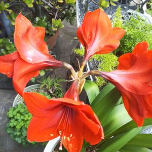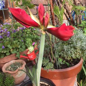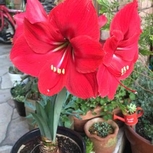 真っ赤なアマリリス、開きましたよ〜😍 この球根、何年か前にどんどん小さく痩せてしまって、放ったらかし過ぎてたせいです😓 それから、肥料をやり葉っぱを大切に育て復活です😀 そしてお花が立派に咲いて、何年目かなぁー⁉️
