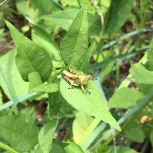 これはたぶんトノサマバッタの幼虫でしょう。 チビのくせにゴージャスな色合いがカッコいい。 ちょこんと葉の上で動かない。 夏山は花よりも虫多し。