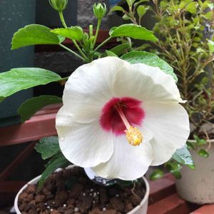写真は開花が期待されるハイビスカスさん。 夏の終わりに見切り品でお迎えした苗なので、まだ花は一度も咲いておりません。とても楽しみです😊咲いたら写真載せます。 ↓以下、悲報🥲 ・玄関の外に置いていたオリヅルランが虫の被害で枯れました。 ・玄関の外で鉢植えで育てていたヒューケラが枯れました。全然水を吸わずおかしいなと葉を触ったら地上部がごっそりもぎ取れてしまい。中にコガネムシの小さい幼虫が数匹いました😱根をごっそり食べられました… 私はガーデニング始めて3年くらい経ちますが、コガネムシの被害は初めてで。 恐ろしい虫ですね…そして芋虫系が大の苦手なので鳥肌が立ちました。慌てて他のヒューケラもチェックしましたが他は大丈夫そうでした。