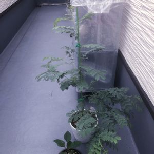 夏の朝水やり忘れて水切れで瀕死になったミモザ。持ち直して花芽まででてきた!大きい鉢に植え直したいけど季節じゃないかなー💦悩む。