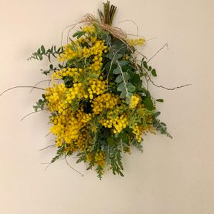 風が強く、少し陽も差している… 未だ春の嵐は来ない。 ミモザがやっと開いてポアポア〜✨ なんちゃってドアによく似合っているなぁ。先日、取手も付けた。 一昨日、風が強く吹いて前に倒れていた。 レモンユーカリが一枝折れてしまった💦 やはり、薄いからね。