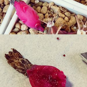 『フライレア狸の子』 蕾を付けていたので花が咲くのを楽しみにしてた そしたら蕾がポロっと取れた 中から種が‼️ いつ咲いたの~⁉️ 調べてみたら、閉鎖花で自家受粉するって(ΦωΦ)ホホォ… と言う事は?… 花芽が出来たら種が出来るって事か(๑°ㅁ°๑)‼💡 豹の子はすんごい数花芽ついてるんですけど!と言う事は種もすんごい出来るのか! 嬉しいけど… どうしよう(˙˙*)?