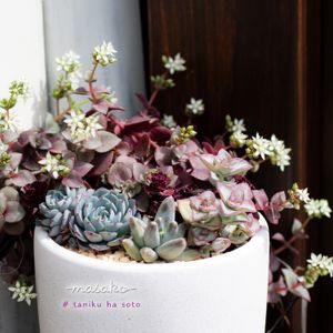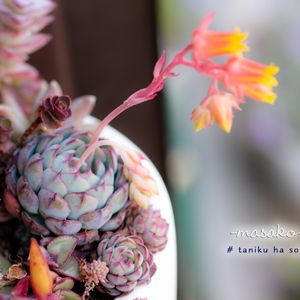 ハッピーさんのお花(*ノ´∀`*)ノ 足元のお子ちゃまふたつはカットしてチマチマ寄せに使わせていただきました。 その奥に、またまたお子ちゃまの姿を発見。ありがたいです。 それにしても、この鉢の全体像はかなりボロボロに… 植えてから1年以上たってくると、狭くて植物たちも辛そうですね。紅葉して可愛いですが… 今冬に凍らせてしまった鉢は色が悪いです。やはり、凍らせてはいけませんね。 植え替えようにも、同じような鉢が多くて、手が回りません(´Д`)(ノ゚Д゚)八(゚Д゚ )ノ もうすぐ梅雨だし、恐怖の夏だし、植え替えストップですかね? みんな、ごめん。今のままで頑張って! 【masakoの多肉No.29】
