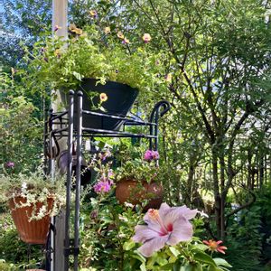 アベリアホープレイズ❤️ 満開です😊斑入りの葉っぱも素敵でとっても丈夫な植物です˖*♬೨̣̥ デュランタ💜 今年は株が暴れてなくてシュッと伸びてます😊綺麗だなぁ ワイヤープランツ💕 花壇で育てたらこの子の太い根っこで他の植物を植えられなくなり昨年リセットしました😅 抜いた枝に土を被せて見事に冬越ししたのを鉢上げして育てることにしました😊このくらいが可愛く管理しやすいです😆 シダ植物🪴 春に枯れかけたけど植え替えと株分けしたら新しい葉っぱが出てきました˖*♬೨̣̥まだ形がアンバランス😆
