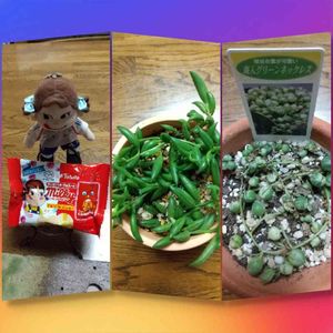 こんばんは😃🌃 グリーンネックレスとペコちゃん、ミルキーチョコレートで、ペコちゃん祭り参加させてくださいね。 班入りグリーンネックレスの状態が悪いです。先日、お水やってから…😓 はじめて、コンビニでペコちゃんのお菓子かいました😄