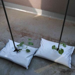 富良野メロンのF4です。 定植には少し遅いかなと思いつつ、恒例の土の袋に植えました。 去年まではトマト同様に袋の上をカットして深い鉢の様な形にしていましたが、ウリ科は根が横に浅く広がるので、今年は袋の真ん中に穴を開けて定植して見ました♪😆 袋がそのままマルチの役割もしてくれて案外いいかもと思ったので試しにやって見ました。 夏は土が極端に熱くなりそうな気もするんですが…。 スノコでも下に敷くといいかもなぁ〜🙄