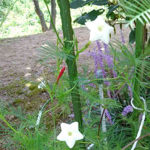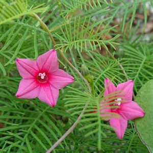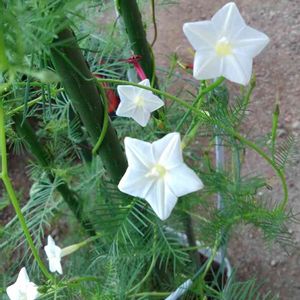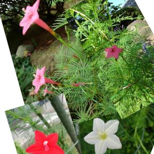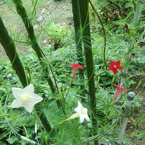 🌱るこう草🌱 今朝一番花が赤色二輪 遅めの種蒔きでしたから これから朝顔と共に見れます! 赤色の定番 白色 ピンク色は何時かな! (和名) ルコウソウ(るこう草) (学名) lpomoea quam oclit (英名) Cypress vine サイプレスバイン ヒルガオ科イボメア属 原産地 熱帯アメリカ フェニックスの葉形に似て 糸状に別れる涼しげな葉 花茎3㌢ほどのつる性草花