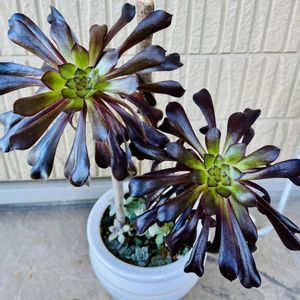 外でのびのびと自由に元気よく育つ青年の木ユッカくんと多肉たち🌿 ユッカくんは鋭く尖った葉を伸ばし 多肉たちはびよ〜んと自由に伸びちゃってる所がイイね😆