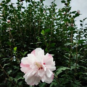 もう1つのムクゲ〝大仙祇園守〟 こちらは2019年8月にお迎えしていました 前picより1年早くお迎えしていたんですね 優しいピンクと白の八重咲き品種 写真の4倍花が付いてます💕 毎年良く咲いてくれますが… 今年は背丈がグンッと伸びて横には拡がらずスリムに 大株になってくれました🙌
