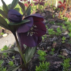 今朝の写真です。 黒いクリスマスローズ はなかなか増えません😅 下草のクルマバソウが地面を覆うように広がってこれから白い花が咲きます🌱✨