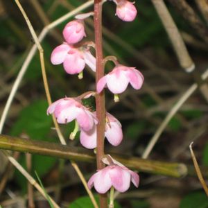 紅花一薬草 イチヤクソウ科 7月 イチヤクソウ独特の真っ直ぐな花柱に、濃い桃色の花が10数個付く。