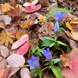 お蕎麦屋さんの山野草の庭。 落ち葉の間からリンドウが咲いてました。 (ピンボケだけど…) アツモリソウも咲くらしくて ぜひ再訪したいです。