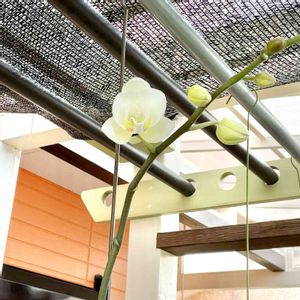 🍀秋🍀 きょうは遮光ネット外しました😄‼︎ ま〜明るいこと❣️ パーゴラには胡蝶蘭とデンドロビウムと 明るさ好む蘭たちを吊ったり掛けたり😙 テラス側のDIYは横引きの梁の塗装終了〜