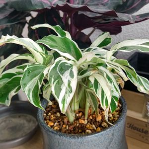 念願のカラテア ホワイトフュージョンです! 植物初心者なのにいきなり ホワイトフュージョンは無謀かと思ったけど一度店頭で見かけてからずっと気になっていました😊 しばらく屋内に置いてあったのか祖返りしている葉がいくつかあります ホワイト部分も縮んでしまってあまり元気ないのかも? 株分けしてグリーン化を阻止したいと思います〜!
