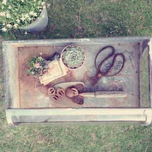 今日の午前中 雨が降りだす前にパシャ✨ 玄関前のお気に入りの脚立の足元にはハーブ いい香りがします🌿🍃