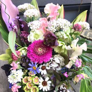 義母へのプレゼントにアレンジメントしました。 お庭のお花にガーベラとスイトピーを加えて少し華やかに✨