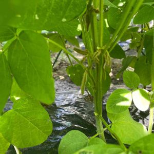 枝豆さん⭐️ 茎にうぶ毛が生えてきて、それらしくなってきました😃 昨日の☔️で倒れない様に網をかけて無事でした❣️