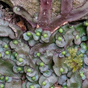 コケに緑のつぶつぶ これは無性生殖の杯状体になるものですか? ④それともあのヤシの木のような雌器床や雄器床の始まり? 苔植物は不思議だらけです 花友さんにお聞きして、ゼニゴケではなくジンガサゴケの雌器床のようです