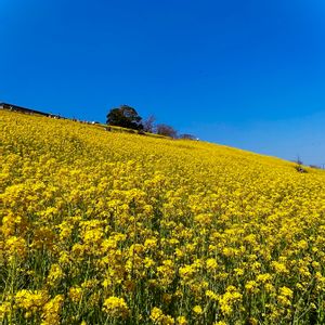 ♬菜の花✲•*¨*•.¸¸♪ マザー牧場にて…。 マザー牧場内にあるグランピング 施設が遠くに見えます。