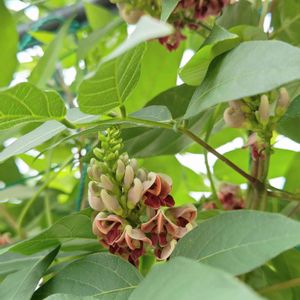 ちょっと薄暗いpicで失礼します😅 何故か今のところ、グリーンカーテンの内側でしか咲いてくれないので、こんな写真です。 アピオスのお花です😊 ほのかに甘い匂いがします✨ 秋の七草のクズに似た可愛いお花です😃 お茶にして飲むと、血糖値抑制効果があるとの事で、ただ今いくつか乾燥させています。 アメリカホドイモとも言います。
