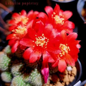 日が出ないので、咲きそうなサボテンを 室内の育成ライト下に移動してみた🌵🔦 pic①②③ Rebutia papirisy レブチア・パピリシー 5月25日満開🌸 真っ赤なお花♥️見事な咲きっぷり🤗 pic④⑤ Parodia mammulosa パロディア(ノトカクタス) 鬼雲丸 '22年11月にHCから小さな鬼雲丸をお迎え 2年半経ち、やっと咲いてくれました💛💛 黄色一色の花びら💛真ん中の雄しべだけ赤❤ 美しいお花です😍 pic⑤ お外に居た、今にも咲きそうな鬼雲丸 パピリシーの花で 🏷真っ赤な火曜日 🏷可憐な火曜日 鬼雲丸の花で 🏷心にメローイエロー 鬼雲丸の毛で覆われた蕾で 🏷おけけの日 参加させていただきます(⋆ᴗ͈ˬᴗ͈)”