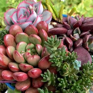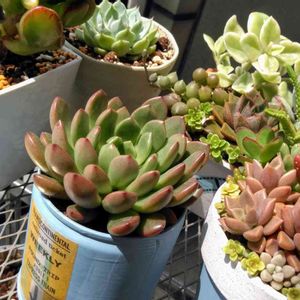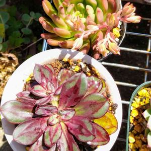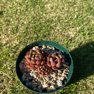 昨日の3つ500円多肉を 変身😘🤩💪 右 お隣りさんからもらった蔦の器に寄植え 左上 ラウリンゼ?お一人様 左下 ピンクルルビー、チョコレート錦メインの寄植え