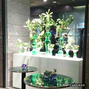 7/21(日)⑧ Bunkamuraのお洒落なお花屋さんのディスプレイです🤗🎵 ショーウィンドウごとにテーマカラーが違います。 ガラスの花器が涼しげでした。 ここはグリーン。 全体を写したら植物がよくわからなくて残念です😅💦