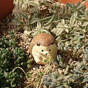 レモータもセダムかと思ってました💦 同じところに置いてあったから( ⊙_⊙) でも寄せ植えしても大丈夫とどこかに書いてあったので、結果よかったかな(๑ºั罒ºั )ヒヒ♡ 成長の見張り役にハリネズミちゃんを置いてみました(ㅅ´ ˘ `)💕