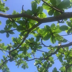 通路一面を覆うコバテイシの落ち葉を朝からせっせとかき集める。赤く色付き葉を落とすこの木は、こちらでは珍しく季節を感じさせてくれる、私にとっては貴重な木。