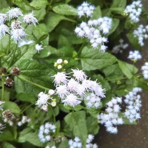 おはようございます☁☺ セイヨウフジバカマ(ユーパトリウム)の白花が沢山咲いていました。とても清楚な佇まいです🌼✨別名ユーパトリウム(ヒヨドリバナ)は旧属名で流通名として残っています。ユーパトリウム(Eupatorium)は、古代小アジアの国王Mithridates Eupatorの名にちなんでつけられたそうです。アゲラタムにそっくりなので、宿根アゲラタムの流通名もありますが、アゲラタムはカッコウアザミ属で別属です。青花が一般的なようです。 【アゲラタムとの見分け方】 花はアゲラタム(カッコウアザミ)にソックリですが、背丈がアゲラタムより高くスッと立っている印象です。西洋フジバカマは葉が茎の上部まで対生ですか、アゲラタムは基部の葉が対生で、上部に行くほど互生に変わります。 キク科コノクリニウム属🌿多年草 和名∶西洋フジバカマ 別名∶ユーパトリウム・青花藤袴・洋種藤袴・宿根アゲラタム 英名:Mist flower 学名:Conoclinium coelestinum(ギリシャ語knos円錐形の+clinium伏せた、小さなベッド 青色の) 原産地:北米南東部・メキシコ 花言葉:ためらい・思いやり