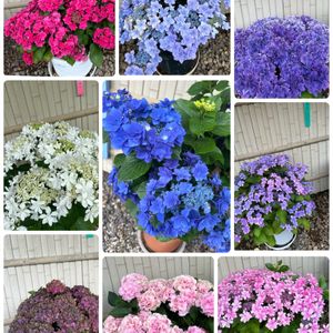 あじさいの里④ 鉢植え展示〜❣️ ⬆️富士の滝 ⬅️春よ恋 ➡️ひな祭り お気に入りです♪
