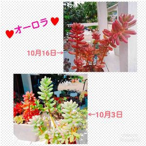 オーロラがだいぶ赤くなってきたなぁ。 多肉植物一年生は寒くなってくるのが楽しみ٩(๑❛ᴗ❛๑)۶ 台風上陸まっしぐらだけど、みんなにはベランダで頑張ってもらおう😅 21号の時も脱落者なかったからきっといける😆👍 皆さまは多肉ちゃんに優しく、ご自身、ご家族もお気をつけくださいm(_ _)m