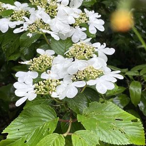 毎年何のお花かなぁと眺めていましたが漸く近寄って見ることができ名前がわかり嬉しく思います 5/10撮影 ヤブデマリ ガマズミ科ガマズミ属 太平洋側の関東地方以西〜四国、九州に分布 山地の丘陵や沢などの湿り気のある林縁に生える 葉は対生 卵形〜長楕円形 先端は尖る 花期 5〜6月 黄色を帯びた小さな両性花の周りに白色の5枚の装飾花をつける 5枚のうち1枚だけ極端に小さいのが特徴的