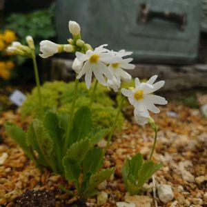 ロックガーデンコーナーの今咲お花🌼.* 白花ミチノクコザクラ 桃花天塩コザクラ 針犬ナズナ 笛吹スイセン