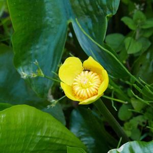 葉に隠れて一つだけお花が咲いてました🌼 *コウホネ(スイレン科)* 名前の由来には複数の説があり、 一説には、川辺に生え、 ワサビ状の白い地下茎が白骨のように見えることから、 「河の骨」の意でこの名がついたとされているそうです🌿