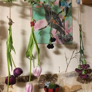 お花を仕立て直し(*´꒳`*)/ハイ! 半分は干しちゃいました💕 後ろにある絵は 下の娘が小学四年生の時に描いたもの☺ とっても気に入っていて😊 ずーっと飾ってあります💕💕