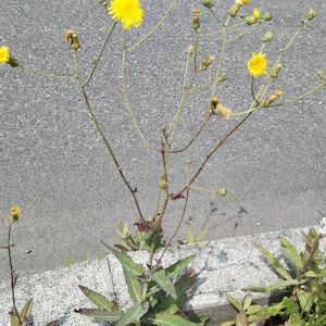 「アレチノゲシ」 アキノノゲシ、トゲチシャと車道挟んで反対側に何個体か並んでいた。 「ハチジョウナ」とよく似ているが葉が下部にかたまり上が間延び気味なので「アレチノゲシ」としました。 これもトゲチシャたちと葉っぱが似ている。もっと葉の切れ込みが深いものもある。