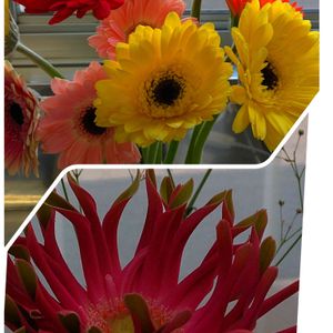 🌿🧡💛❤️ ガーベラ ❤️💛🧡🌿 キク科 ガーベラ属 宿根草 原産地 「南アフリカ」 花言葉💐 「応援」 「頑張れ」 ↓炎🔥様な真っ赤なガーベラも有るんですね⁉️ 見るだけで元気が分けて貰えそうな花です🎶❤️💛🧡🤗😍
