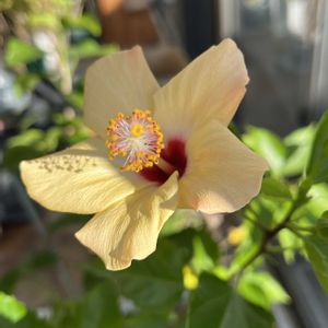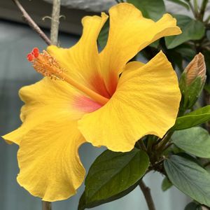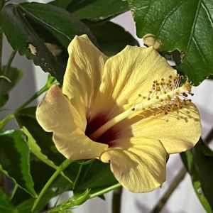 ハイビスカス🌺イエローユカリンが部屋の中で咲きました❣️ 夏に咲いた時より小さめですね😅