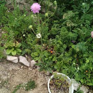こんにちは😃 バーベナを植えている丸いプランターに スモークグラスがこぼれだねで生えてます