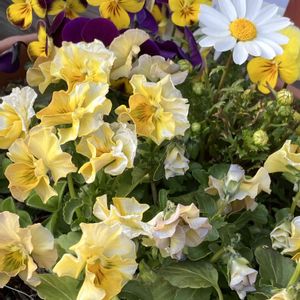 手前。大好き格安見切品😘ミルフルのアンティークフリルと札にあり✨何色なのかもわからず元気そうな子をお迎えして植えた12月かな⁈もりもりイエローでした🙌ちなみに周りの子達もみんなこぼれ種子出身😆見事な🟡系の寄植えの出来上がり💕。゚+.(*`・∀・´*)゚+.゚切り戻ししようかなぁ…