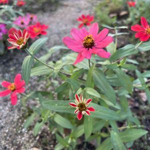 こぼれ種からのジニア、この色は花壇の中や外のあちこちに咲いています 開きかけのつぼみが可愛いです😊