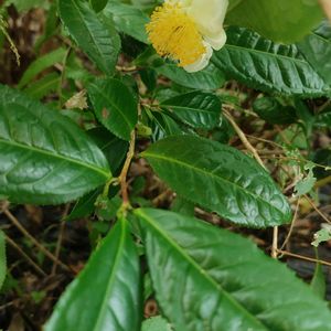 2本あるお茶の木は、強剪定したので、花がなかったのですが、紫陽花の近くで、こぼれ種からのお茶の木に花が咲いてました。 サザンカのようで、小さな花です。